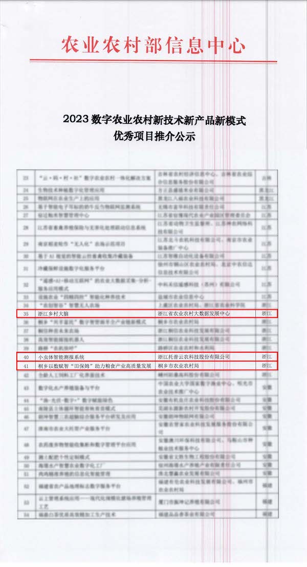 近日,農(nóng)業(yè)農(nóng)村部信息中心公布了“2023數(shù)字農(nóng)業(yè)農(nóng)村新技術(shù)新產(chǎn)品新模式擬推介優(yōu)秀項目”名單,由浙江托普云農(nóng)科技股份有限公司(以下簡稱“托普云農(nóng)”)及其子公司浙江森特信息技術(shù)有限公司技術(shù)支撐的三個項目“浙江鄉(xiāng)村大腦”、“小蟲體智能測報系統(tǒng)”、“桐鄉(xiāng)以數(shù)賦智‘田保姆’助力糧食產(chǎn)業(yè)高質(zhì)量發(fā)展”從全國眾多優(yōu)秀項目案例中脫穎而出,榮列推介優(yōu)秀項目名單。