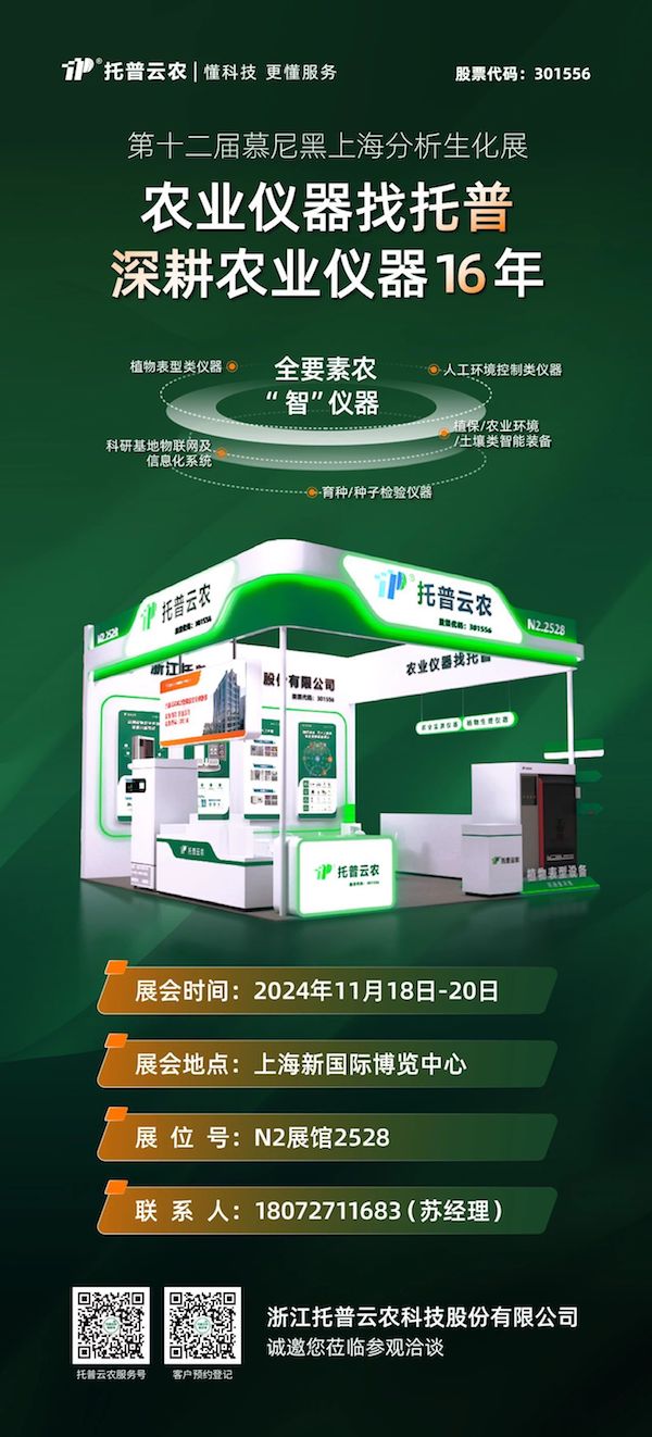 本次大會,托普云農(nóng)將攜人工環(huán)境控制類儀器、植物表型類儀器、育種/種子檢驗儀器、植保/農(nóng)業(yè)環(huán)境/土壤類智能裝備等全要素農(nóng)業(yè)儀器參展,用科技為傳統(tǒng)農(nóng)業(yè)生產(chǎn)、科研賦能。