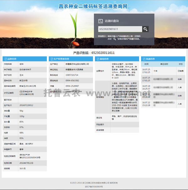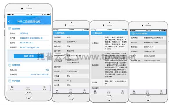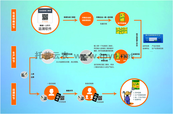 此環(huán)節(jié)中,所有生產(chǎn)及流通過程信息已同步到托普農(nóng)作物種子二維碼標(biāo)簽追溯系統(tǒng)。消費(fèi)者、執(zhí)法者、經(jīng)營者均可通過手機(jī)掃描二維碼得知種子生產(chǎn)流通過程。
