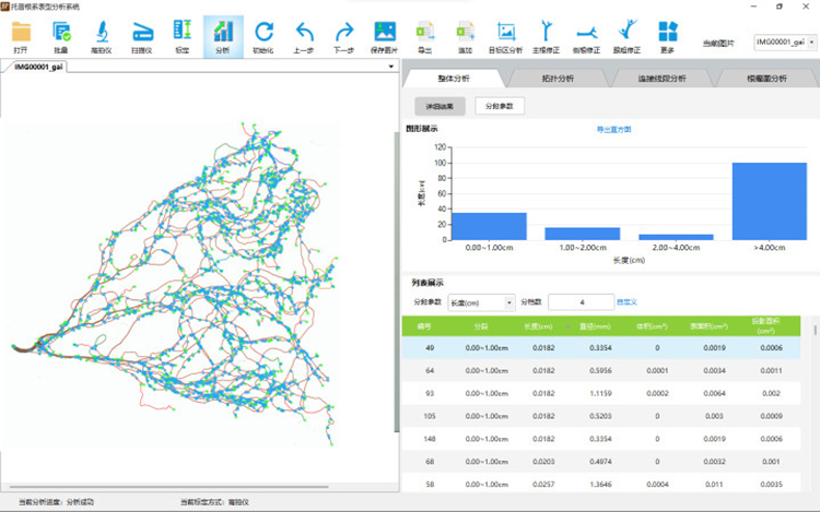 一鍵分析多項(xiàng)參數(shù):一鍵操作,精準(zhǔn)獲取根總數(shù)、根尖數(shù)量、根總長(zhǎng)、根平均直徑、根總投影面積、根總體積、R/G/B、RHS、總連接點(diǎn)數(shù)、端點(diǎn)、關(guān)節(jié)點(diǎn)、連接點(diǎn)數(shù)、分叉數(shù)、交疊數(shù)、盒維數(shù)等多項(xiàng)參數(shù);